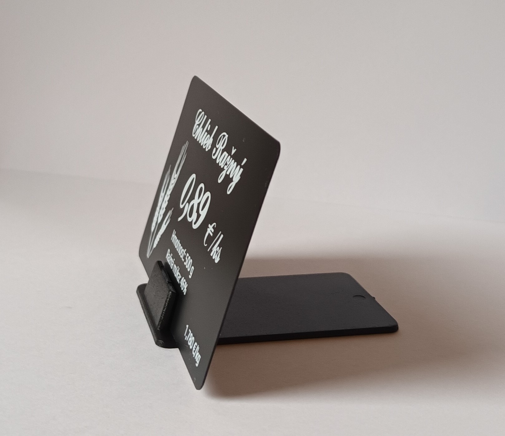 Nízky držiak - stojanček na cenovky v čiernom prevedení. Cenovku je možné vložiť v 75 stupňovom uhle, nie je možné meniť.