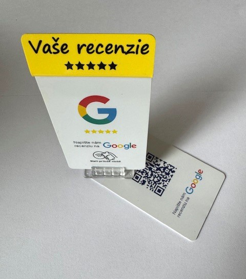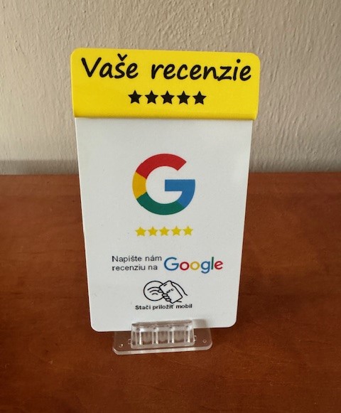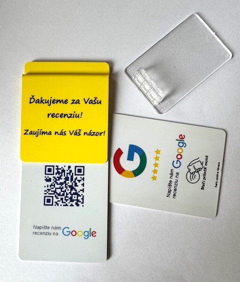 Karta s potlačou obsahuje NFC čip vrátanie naprogramovania pre hodnotenie Vašej firmy cez Google recenzie.